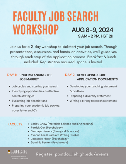 Looking for feedback on your research/teaching statement?  This opportunity is open to postdocs across all disciplines.  Send us a draft of your job application materials (research, teaching, or diversity statements) in advance and take advantage of a one-on-one consult with Dr. Kate Bullard, Director of Research Development or Dr. Yvonne Lee, Director of Writing Across the Curriculum.  Book your appointment here >