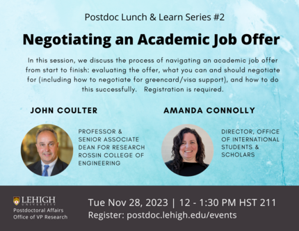 In this session, we discuss the process of navigating an academic job offer from start to finish: evaluating the offer, what you can and should negotiate for (including how to negotiate for greencard/visa support), and how to do this successfully. RCEAS Senior Associate Dean and Professor John Coulter and Director of International Students and Scholars will share their expertise on this topic. Register here >
