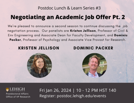 We’re pleased to announce a second session to continue discussing the job negotiation process. Our panelists are Kristen Jellison, Professor of Civil & Env Engineering and Associate Dean for Faculty Development, and Dominic Packer, Professor of Psychology and Associate Vice Provost for Research. Register here >