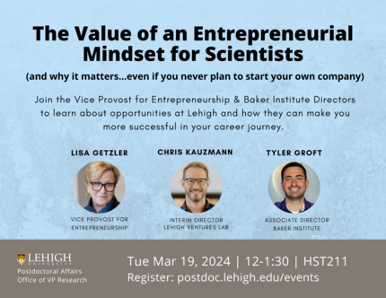Join the Vice Provost for Entrepreneurship & Baker Institute Directors to learn about opportunities at Lehigh and how they can make you more successful in your career journey.  Register here >