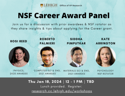 Join us for a discussion with prior awardees Rosi Reed (Physics), Siddha Pimputkar (Mat Sci), Roberto Palmieri (Comp Sci) and NSF rotator  Kate Arrington (Psychology) as they share insights and tips about applying for the NSF Career award.  You do not have to be applying for the award this year to attend.  Lunch provided.  More info here >