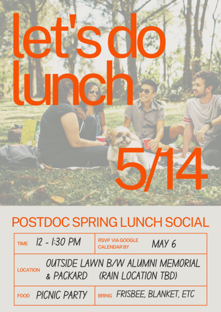Join us for the Postdoc Spring Lunch Social to celebrate the end of the semester and start of summer.  We'll meet outside on the lawn between Alumni Memorial and Packer Lab (corner of Brodhead and Packer Ave). This is a great opportunity to recharge and enjoy good food and company.  Bring a frisbee, a picnic blanket if you like!  Can't say the whole time? Just drop in, say hello, and take something to go.  Veggie options will be available.